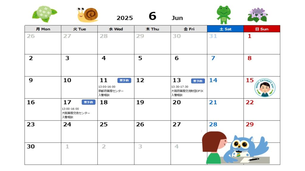 相談会のお知らせ(6月の予定)大阪入管の職員が出張して、在留資格などに関する相談に対応します