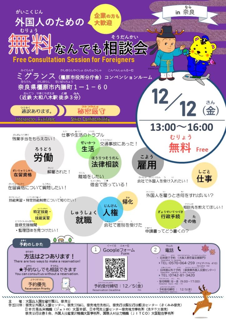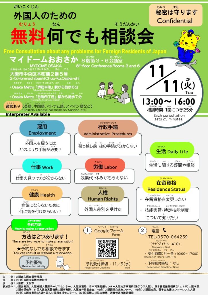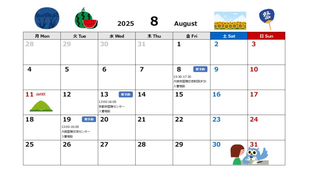 相談会のお知らせ(8月の予定)大阪入管の職員が出張して、在留資格などに関する相談に対応します
